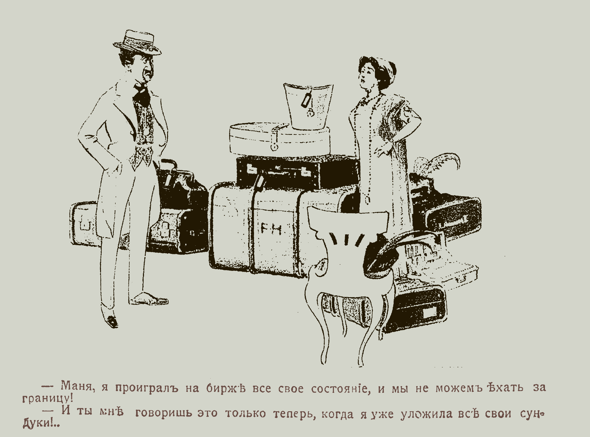 Большое количество багажа обычный дамский атрибут в путешествии. А как иначе отправиться в поездку на 6-10 недель? Опытные путешественники даже стараются избегать мест около хорошеньких барышень. Вот как описывает свой опыт публицист Александр Амфитеатров: