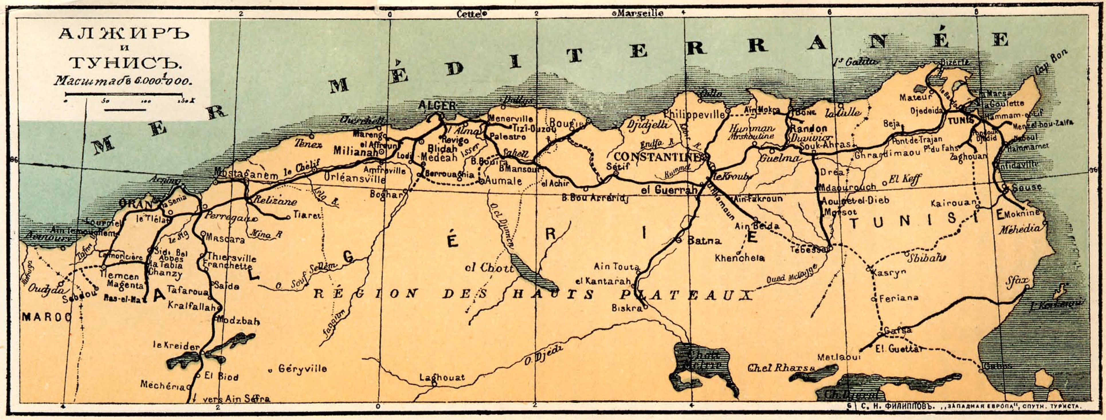 Знаменитый «Спутник туриста» Филиппова (пожалуй, главный русский путеводитель по Западной Европе) помещает Тунис и Алжир во французский раздел гида. Пароходы из Марселя прибывают прямо в столицу – одноимённый город Тунис. Центр города вполне европейский, а вот в арабские окраины лучше без надобности не заходить. Тунис – третий город Африки. Из 170.000 населения – 80000 арабы, 40000 – евреи, носящие арабское платье, остальные 50000 европейцы – преимущественно французы и итальянцы.