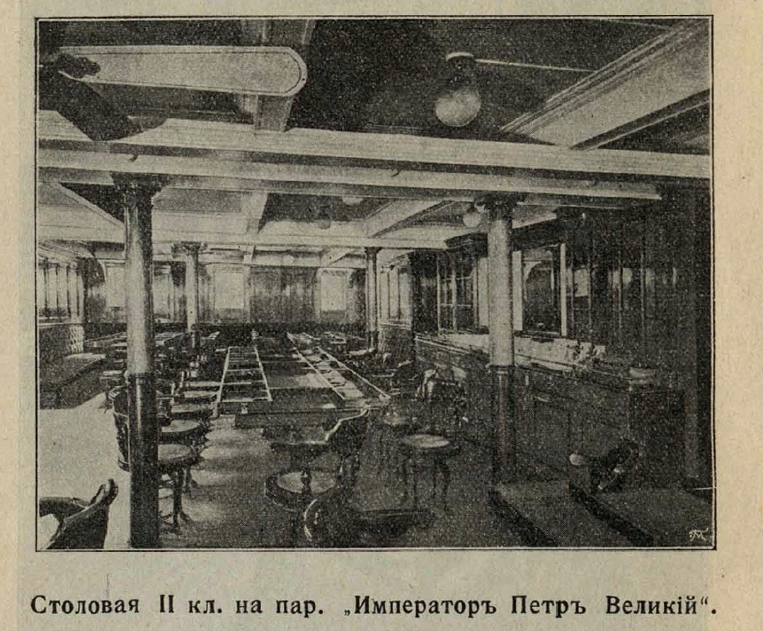 Обратимся к самому важному на борту судна – питанию. Приёмы пищи на Александрийской линии проходят по фиксированному меню (table d’hote). Рассмотрим обычный обеденный распорядок дня I и II класса: