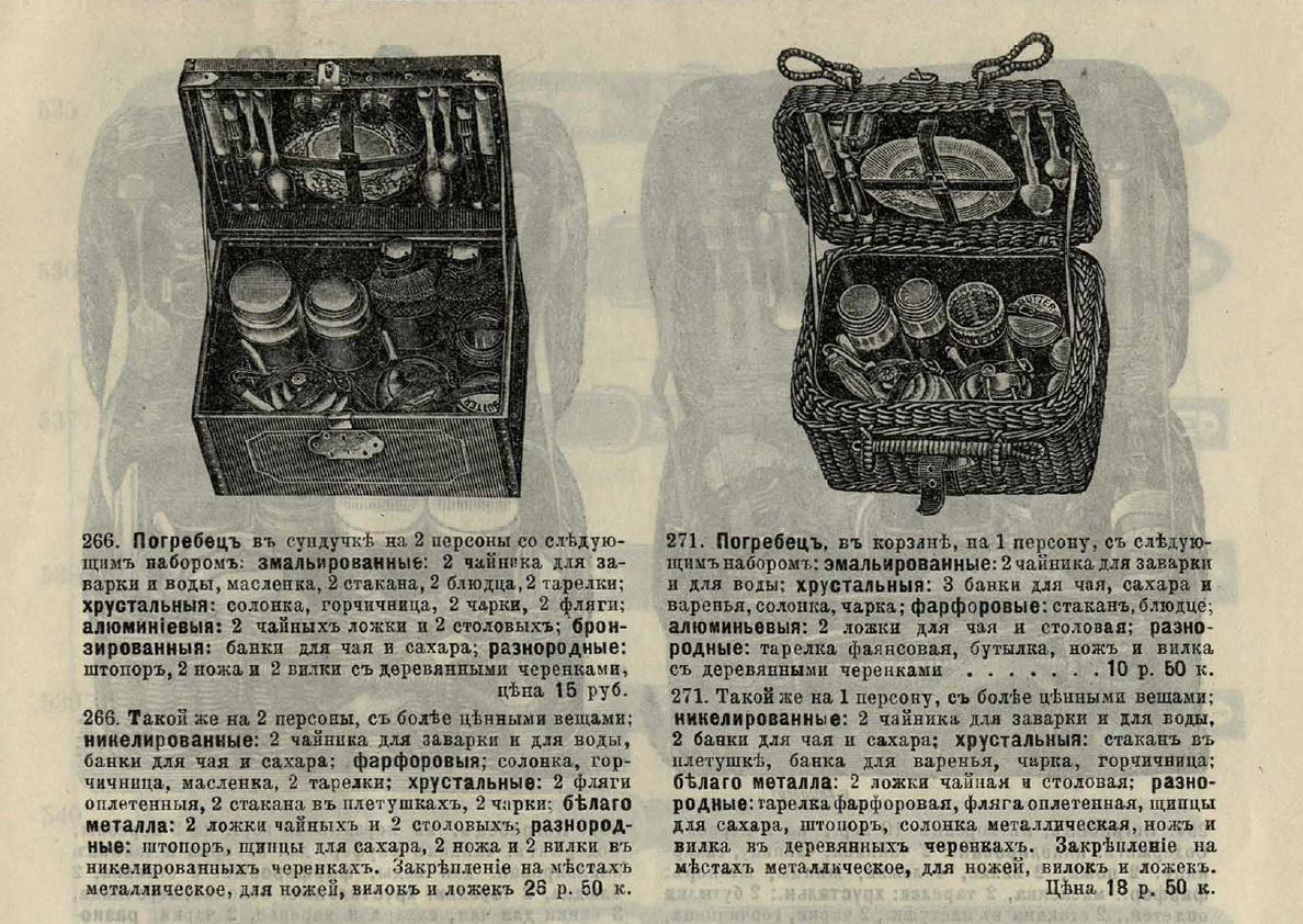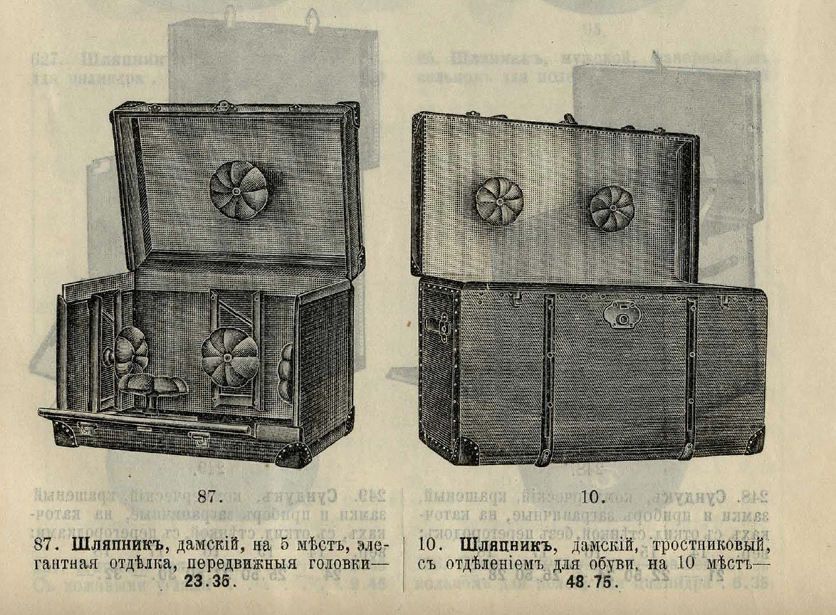Отечественные универмаги предлагают путешественникам широкий спектр необходимых принадлежностей и аксессуаров. Традиционно раз в сезон выходит отдельный каталог-прейскурант со всеми актуальными новинками из мира дорожных вещей. Вот несколько иллюстраций из подобного каталога известного московского универмага «Мюр и Мерилиз»: