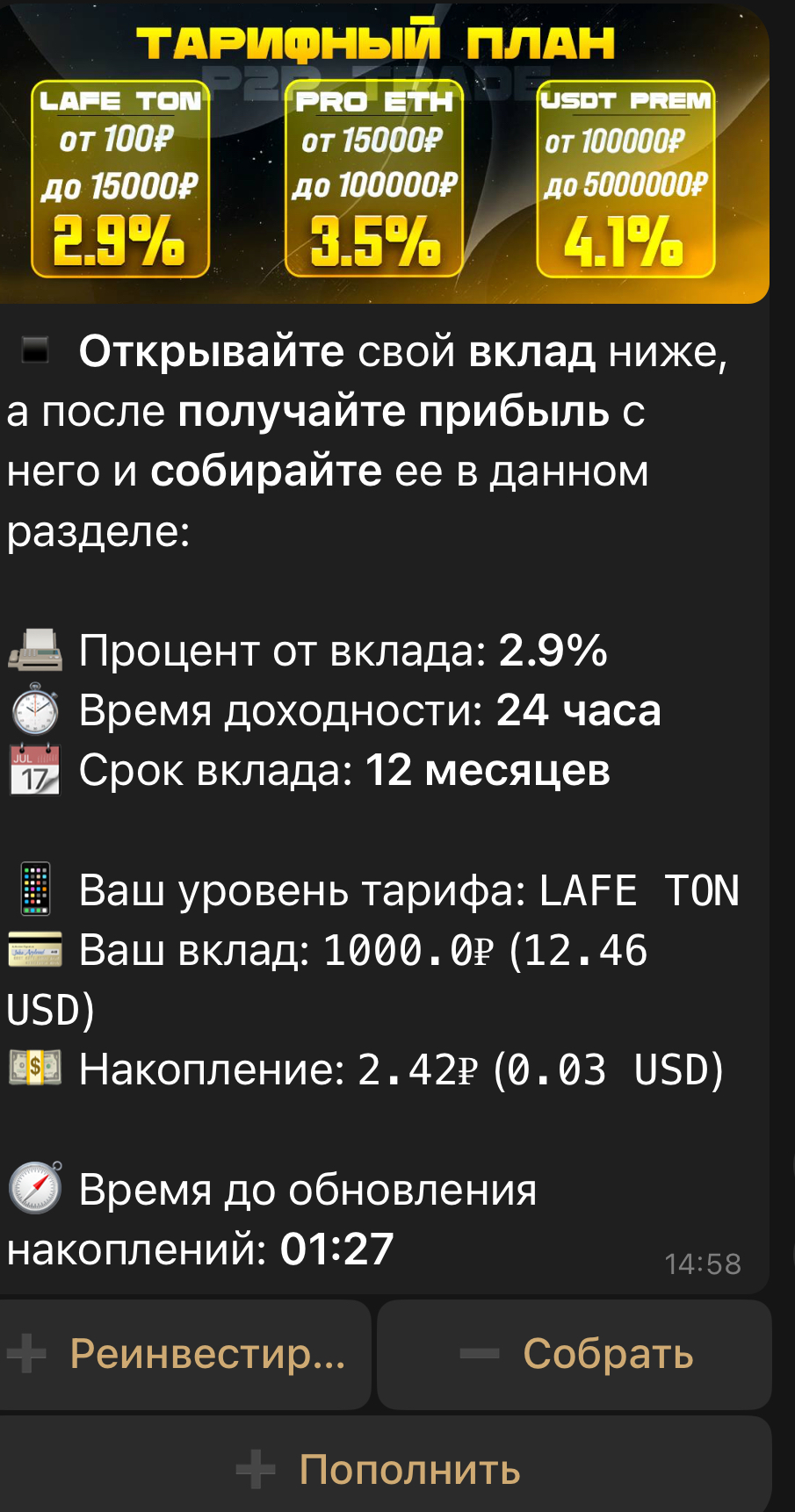 Поздравляем мы рады сотрудничеству ваши инвестиции пополнены с заработком 2.9% - 4.1% в сутки 290 - 410₽✅