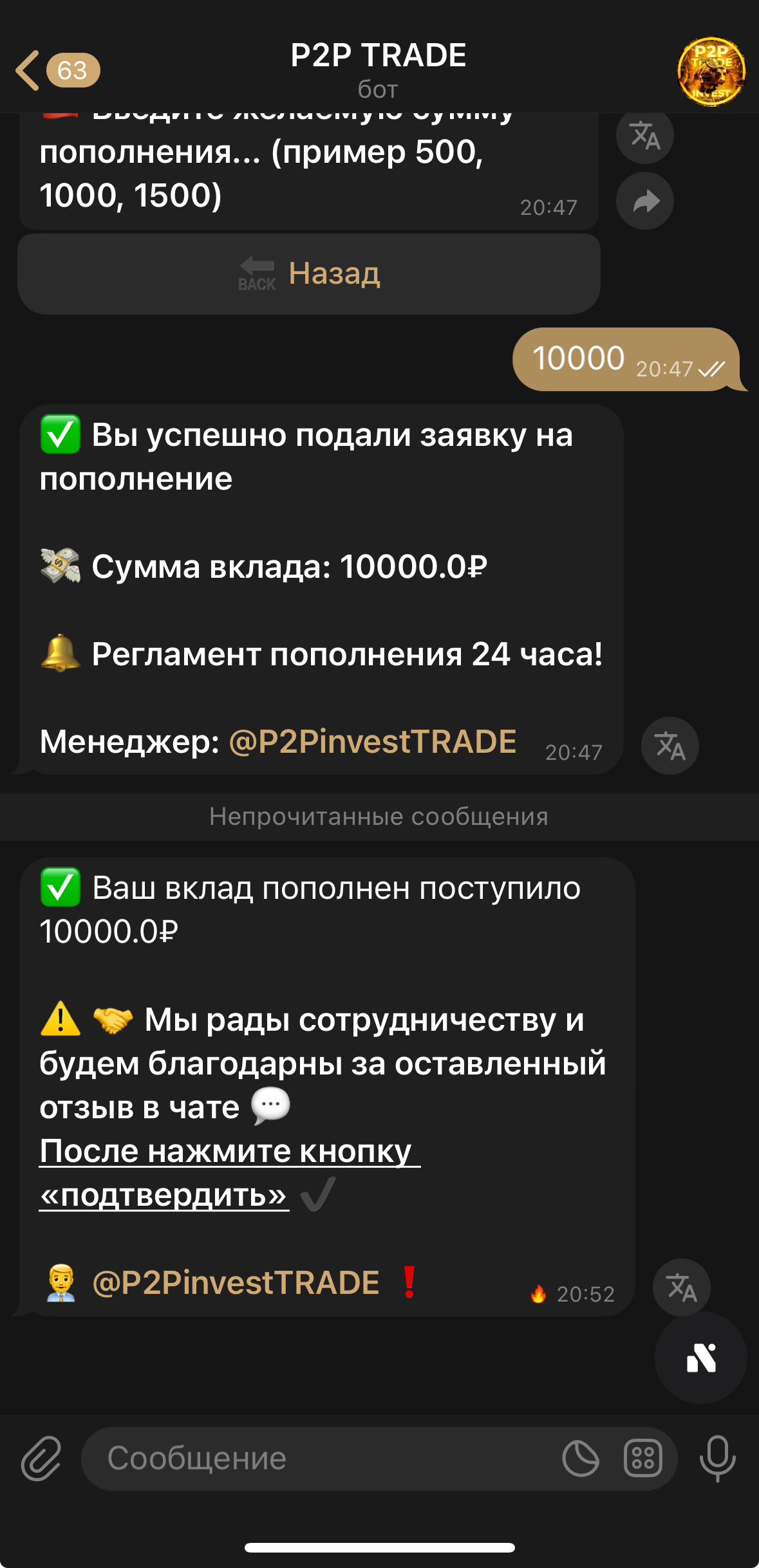 • ВАШ БАЛАНС ПОПОЛНЕН | менеджер обработает вашу заявку о пополнении и вы получите уведомление об зачислении средств на ваш вклад в боте