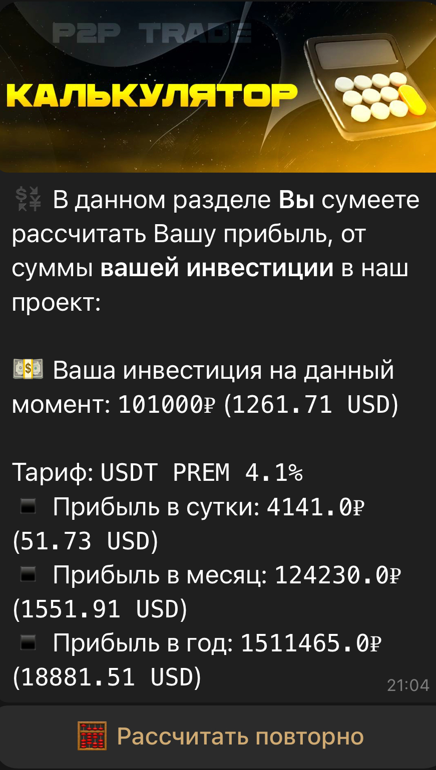 Для того чтобы рассчитать свою прибыль вам необходимо перейти в раздел « КАЛЬКУЛЯТОР » и увидеть свой пассивный доход