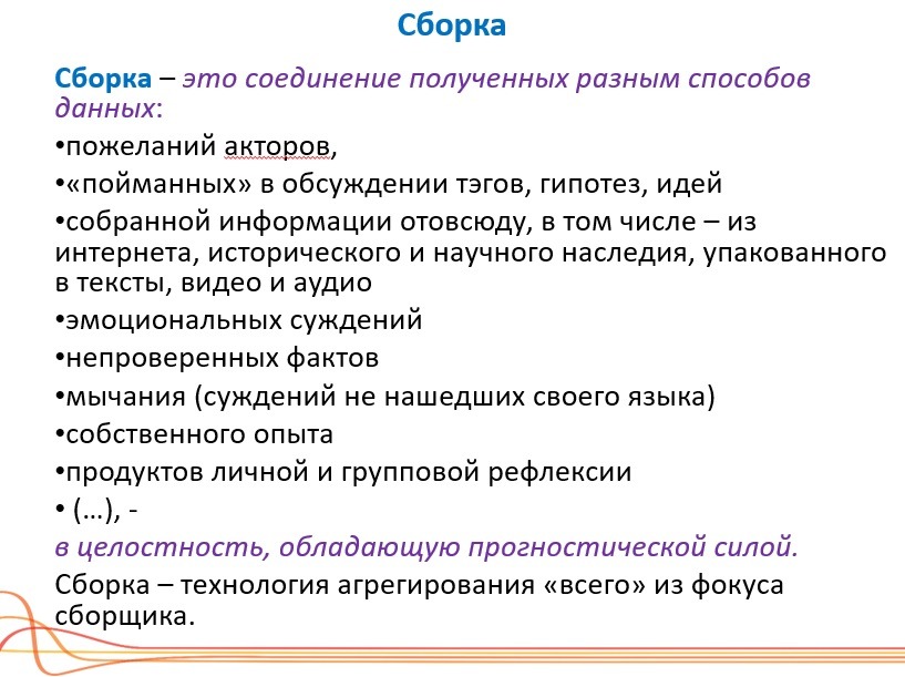 Что собирается: пожелание людей (акторов), пойманных в обсуждения тегов, гипотез, идей; собранная информация – эмоций, эмоциональных суждений, непроверенных фактов. Смотрите, тот же Менделеев собирал таблицу Менделеева, имея кучу непроверенных фактов, относительно химических элементов. Многие из этих фактов, как выяснилось, в дальнейшем были ошибочны. Для сборщика наличие отдельных ошибочных фактов не играет никакой роли. Сборка делается поверх этих ошибок. Собирается «мычание» – это суждения, которые не смогли найти ни слов, ни языка. Собирается поэзис. Используется собственный опыт. Используется рефлексия. Всё вместе вы агрегируете из фокуса сборщика.