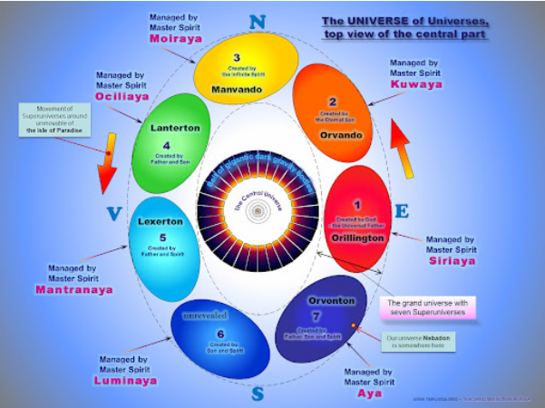 Your local universe of Nebadon belongs to Orvonton, the seventh superuniverse, which swings on between superuniverses one and six, having not long since (as we reckon time) turned the south-eastern bend of the superuniverse space level.