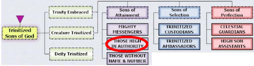 ... three orders, Mighty Messengers, Those High in Authority, and Those without Name and Number, are glorified ascendant mortals. ... As a class, these three orders are known as Trinitized Sons of Attainment, being of dual origin but now of Trinity service. Thus was the executive branch of the superuniverse government enlarged to include the glorified and perfected children of the evolutionary worlds.