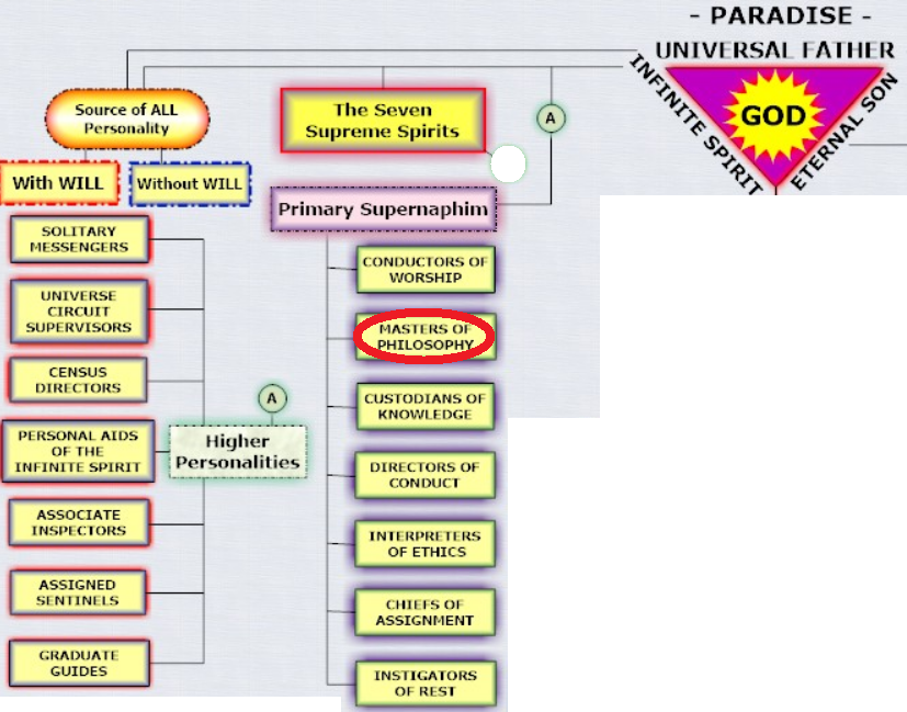 Райская классификация живых существ ►III. СУЩЕСТВА ОДИНОЧНОГО ПРОИСХОЖДЕНИЯ ►►В. Семейство Бесконечного Духа ►►►11. Супернафимы ►►►►[Далее известно: из первичных супернафов, служивших на Острове и отправлявшихся в миры пространства в качестве руководителей; высокие ангелы, 7 чинов ►2. Преподаватели философии. 27:0.5]