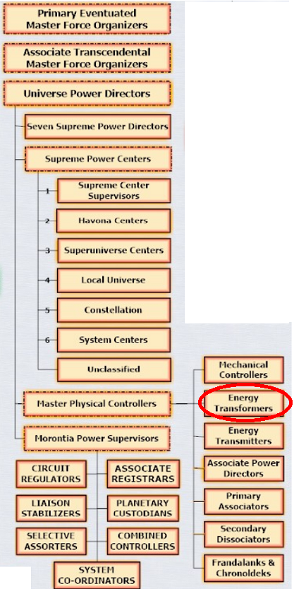 The energy transformers are the conjoint creation of the Seven Supreme Power Directors and the Seven Centre Supervisors. They are among the more personal orders of physical controllers, and except when an associate power director is present on an inhabited world, the transformers are in command. They are the planetary inspectors of all departing seraphic transports.