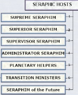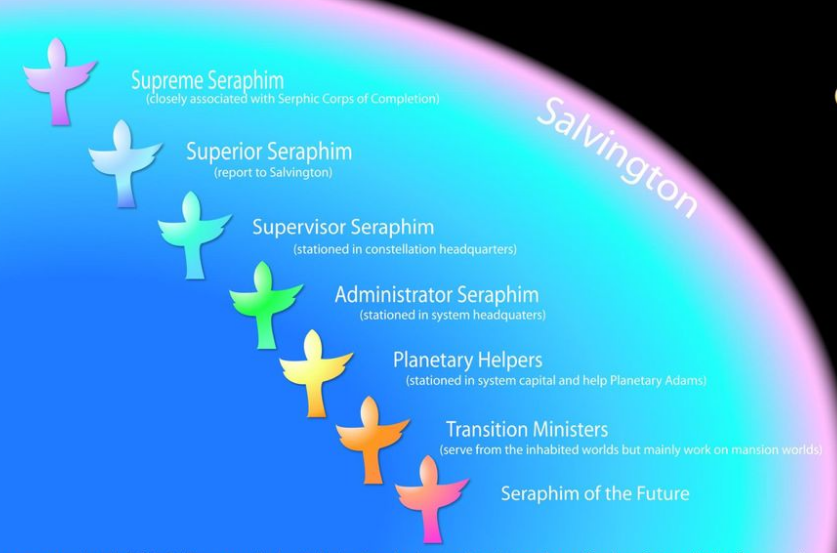 Главы по теме: 38:1 Происхождение серафимов • 38:4 Серафические миры • 38:5 Подготовка серафимов • 38:6 Серафическая организация • 39 Серафические воинства • 40:1 Эволюционные серафимы.