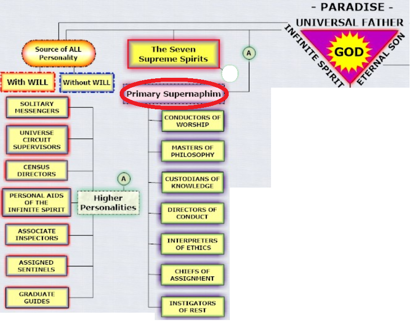 ... the Paradise supernaphim, the highest order of all the ministering spirits, those beings who, as a universal class, ever attend you from the world of your origin until you are finally bidden farewell by the conductors of worship as you take the Trinity oath of eternity and are mustered into the Mortal Corps of the Finality.