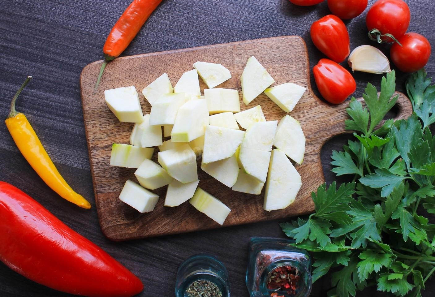 Кабачок хорошо вымойте и удалите хвостики с обеих сторон. Если у вас зрелый кабачок, то срежьте с него шкурку и удалите семена. Молодой плод можно оставить в том виде, как он есть. Итак, овощ нарежьте произвольно не очень крупно.