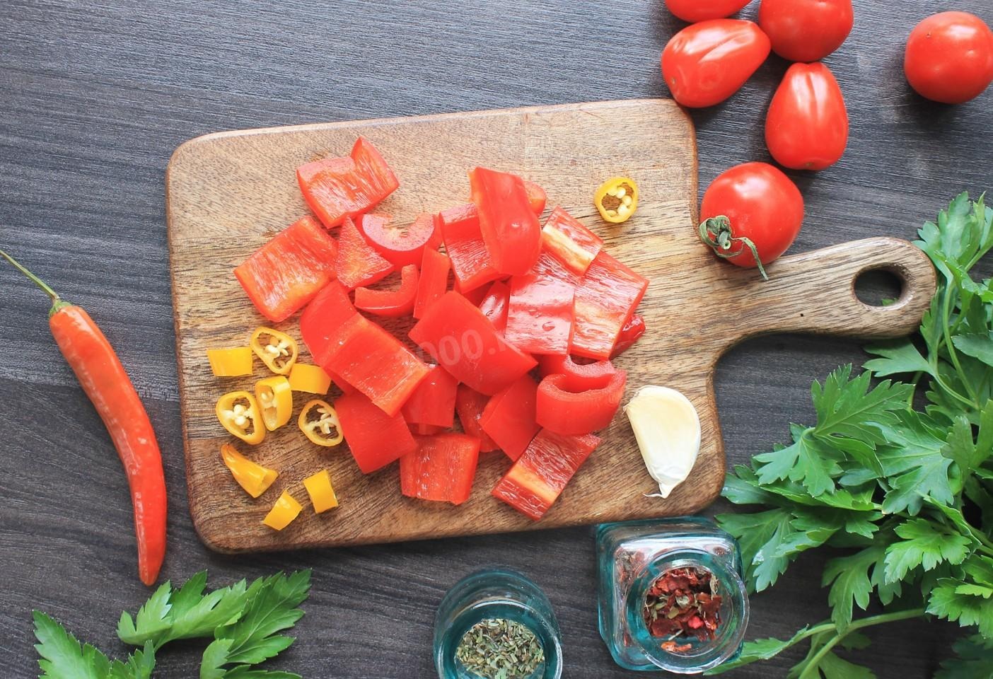 Болгарский перец и перец чили ополосните и обсушите. Какой перец лучше использовать? Идеально подойдут плоды красного перца, они как правило более мясистые в отличие от жёлтых и зелёных. Количество перца чили увеличьте или уменьшите по своему вкусу, либо вовсе исключите из рецепта, если не любите острые блюда. У перцев срежьте места крепления плодоножек, сердцевинки и уберите семена. Нарежьте не очень крупно.