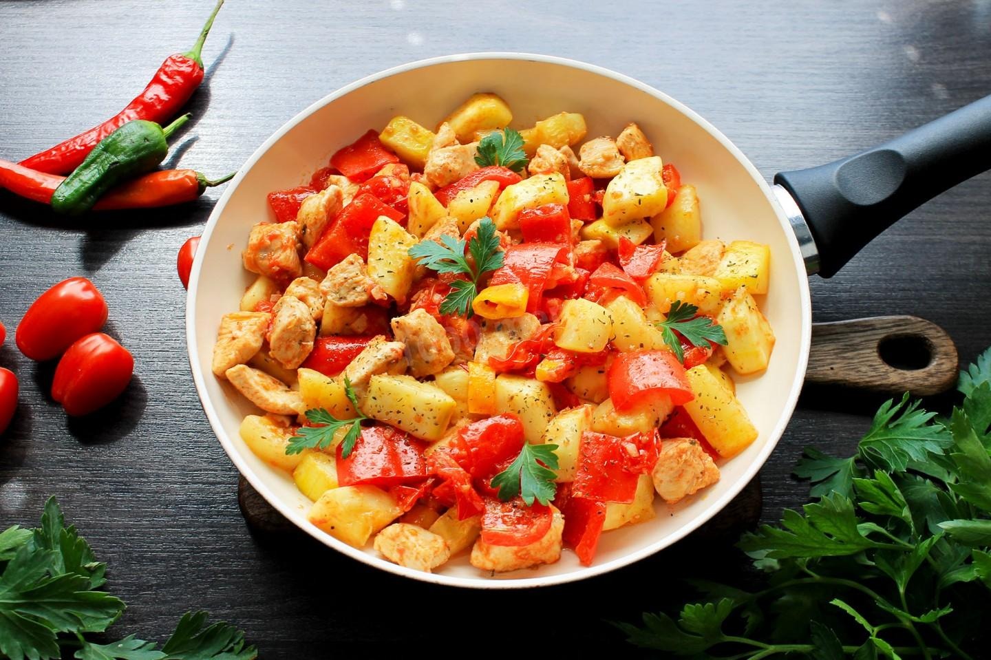 В сковородке с толстым дном разогрейте растительное масло. Отправьте курицу и измельчённые овощи в сковороду.