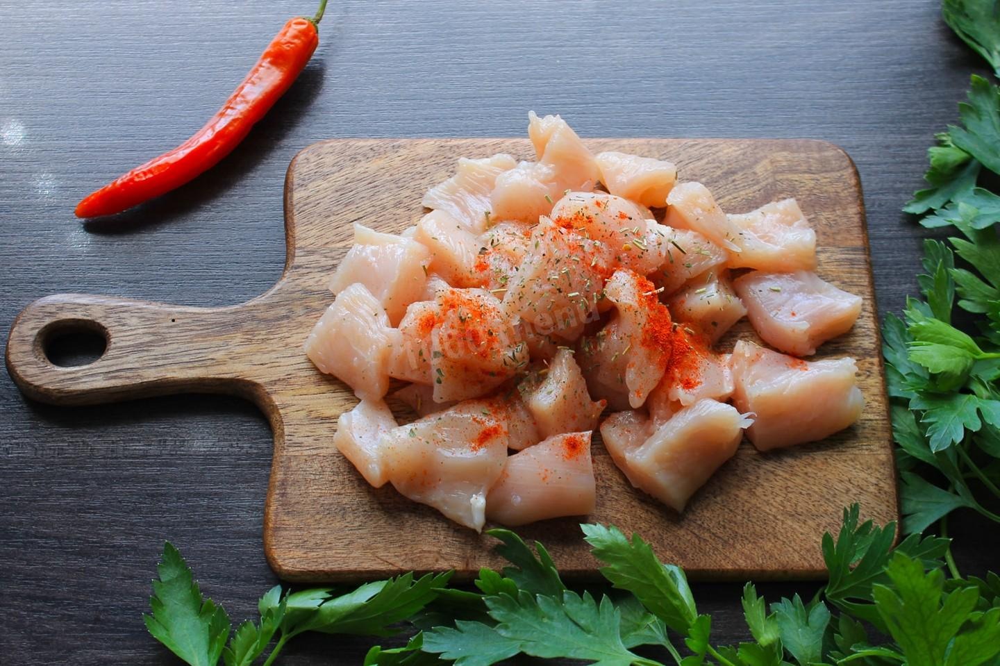 Куриное филе ополосните и обязательно обсушите, чтобы избавиться от лишней влаги. Нарежьте курицу небольшими кубиками, посыпьте любимыми специями. В рецепте использовались молотые перцы, сухой тимьян, базилик, розмарин и орегано.