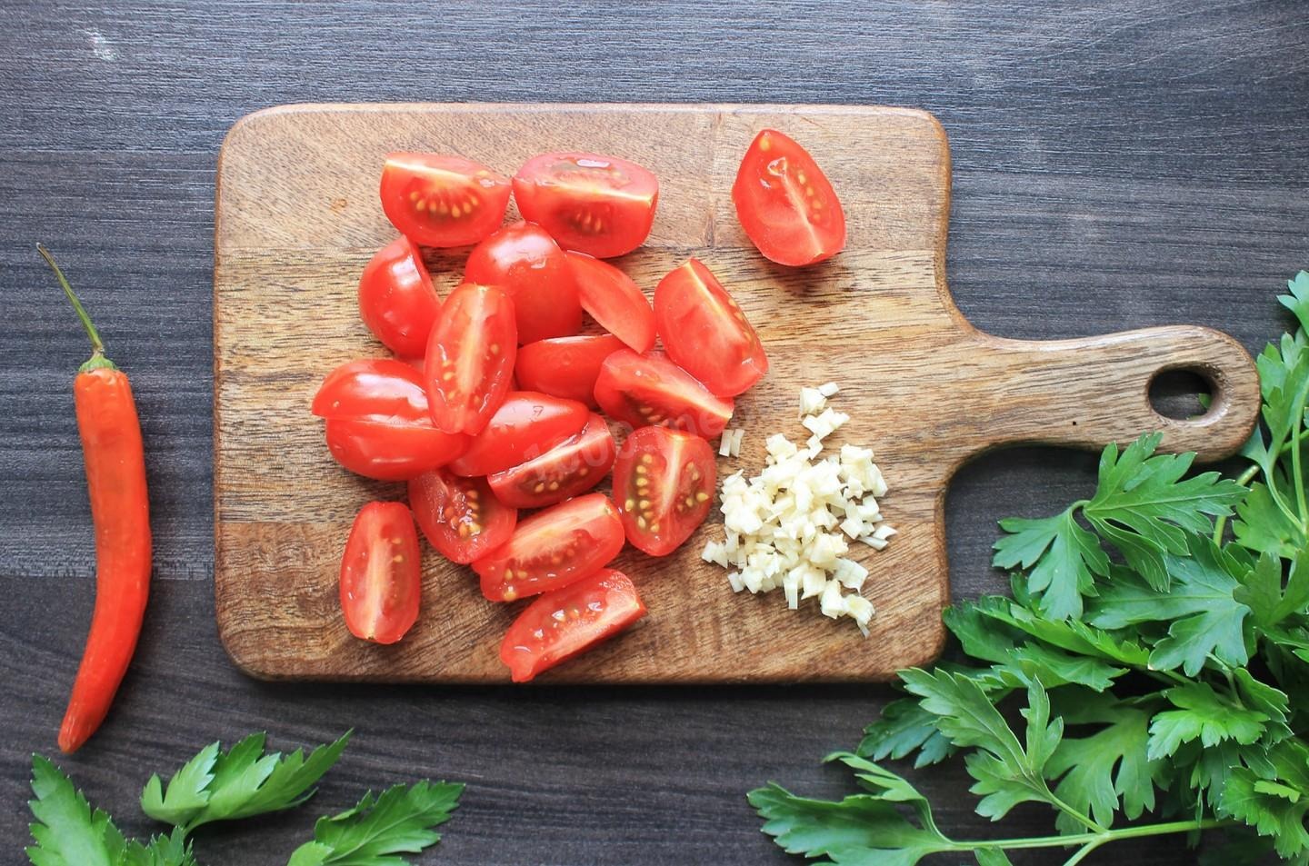 Чеснок очистите от кожуры, помидоры черри вымойте. Зубок чеснока измельчите максимально или пропустите через пресс. Каждый помидор разрежьте на четыре части.