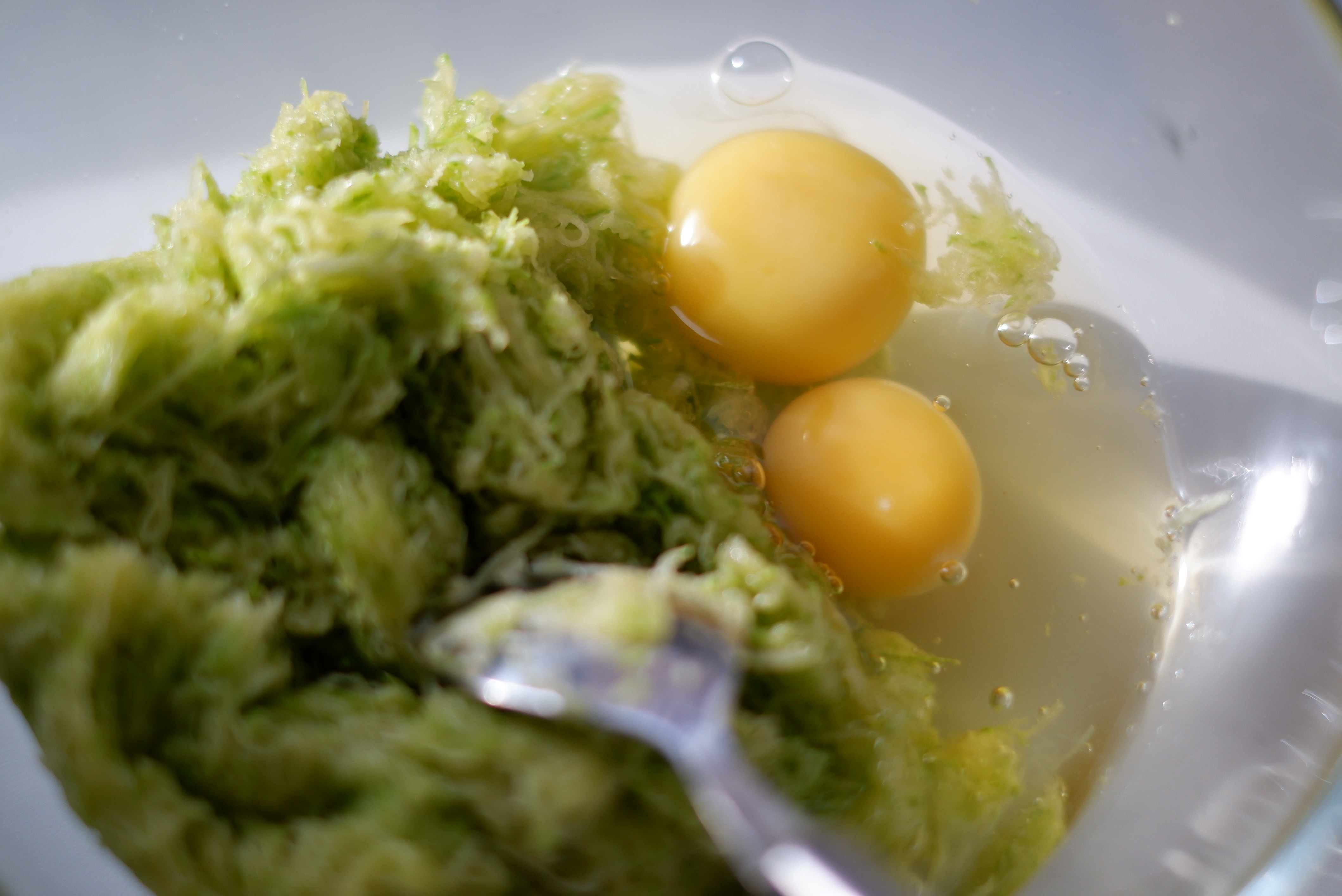 3. К отжатым кабачкам добавляем яйца, перемешиваем