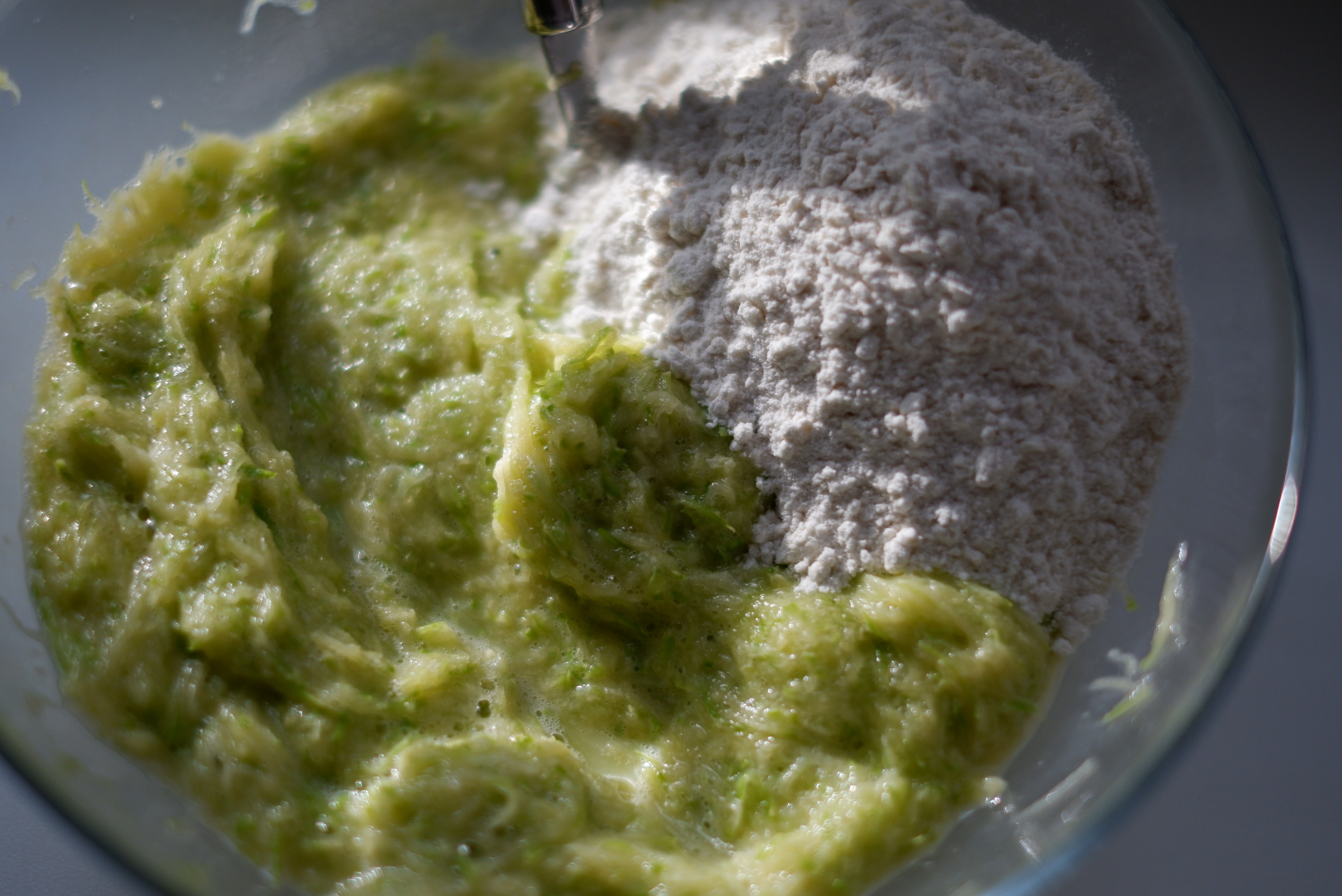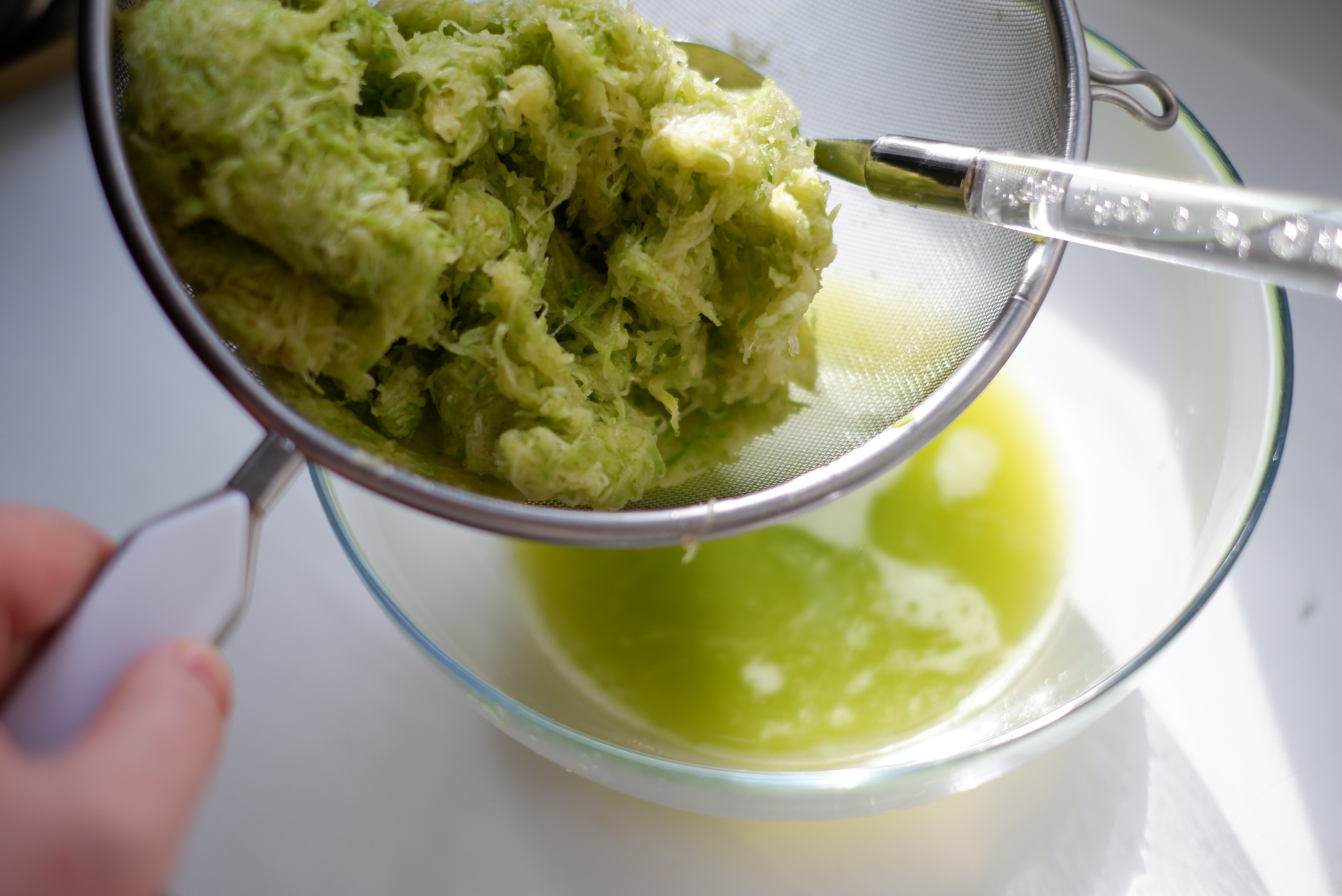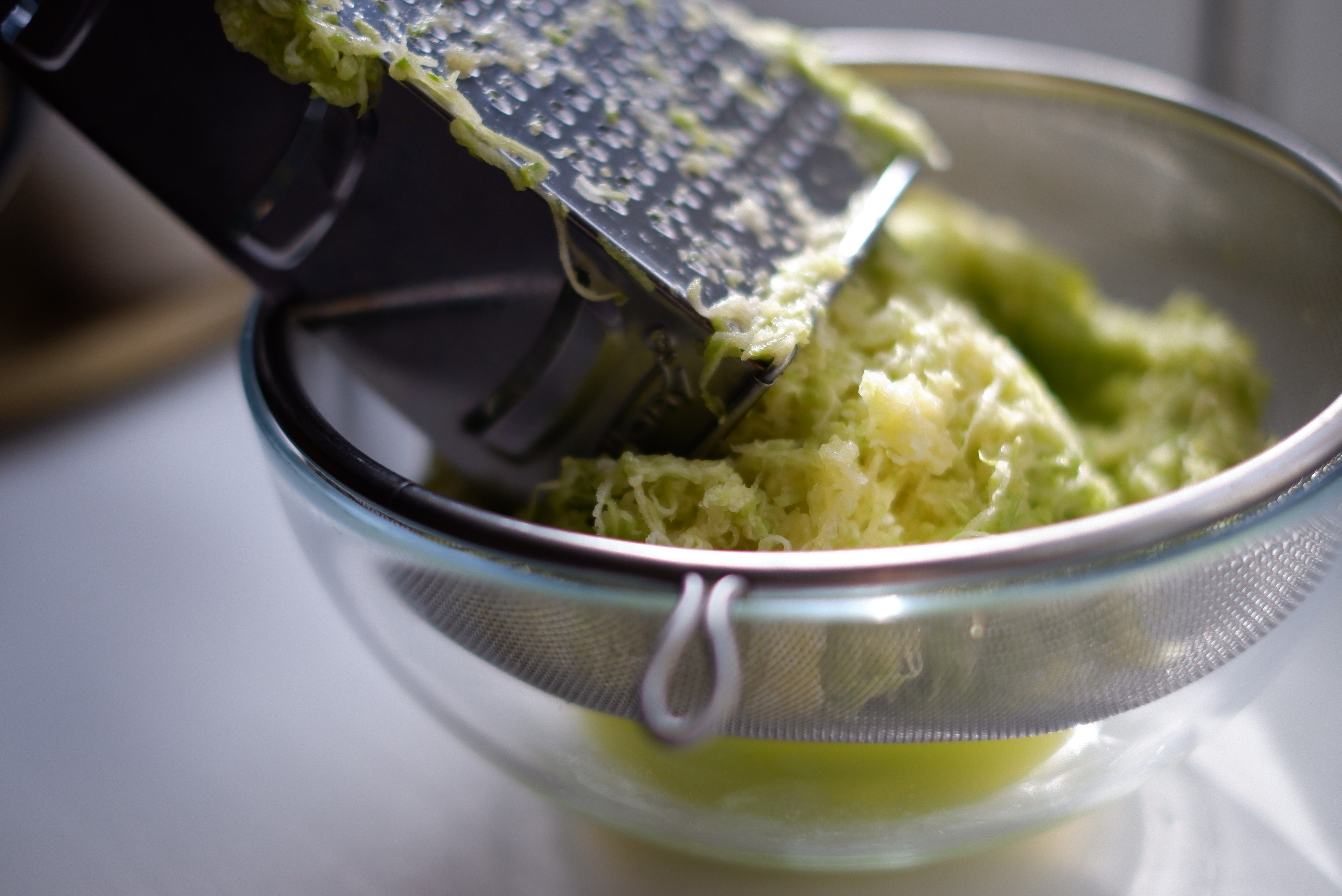 - Кабачок натираем на мелкой терке. Я рекомендую делать это в сито вставленное в миску, чтобы сок стекал в процессе