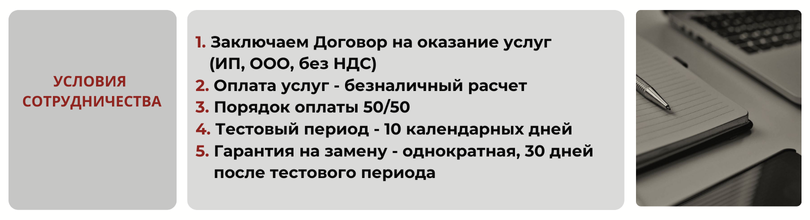 Для нас важно, чтобы кандидат подходил не только по своим знаниям и опыту, но и гармонично вписывался в темп, стиль и правила вашей компании. Именно это создает основу для долгосрочного сотрудничества.