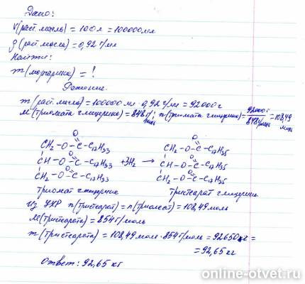 Из 100 л растительного масла (триолеат глицерина) плотностью 0, 92 г / мл можно получить маргарин массой____кг .