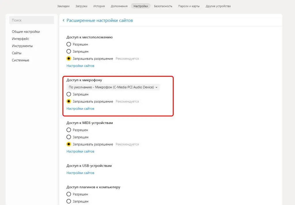 Разрешения для сайтов . . . - Яндекс
