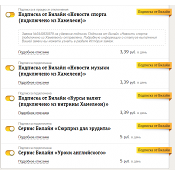 Сего помощью вы можете контролировать подписки и услуги и удалять ненужные. Для этого скачайте приложение на телефон, авторизуйтесь и перейдите в раздел «Услуги». Ранее с помощью приложения можно было управлять только услугами от Билайн, но теперь появилась возможность просматривать весь список услуг, который предоставляют конент-провайдеры (справочная и развлекательная информация, игры, мелодии, погода, конкурсы и т.д.) и управлять им. Вы можете получить подробную информацию о подписке: