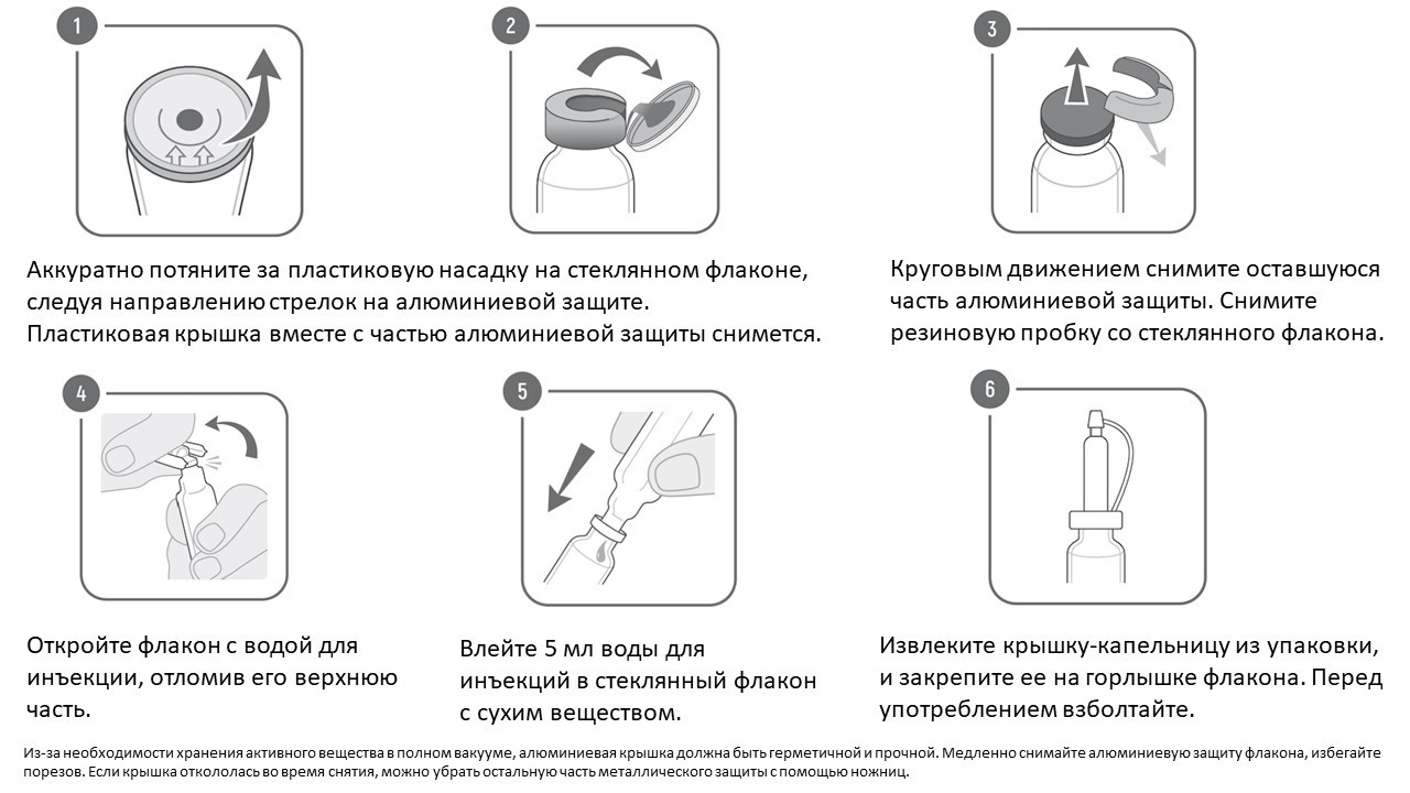 Инструкция по применению и дозировка Медикамент используется интраназально . Прежде чем начать лечение, необходимо правильно приготовить раствор . Для этого следует: Аккуратно поддеть пальцем крышечку флакона, изготовленную из пластика, не отрывая ее полностью . Двигаясь по кругу, снять эту крышечку вместе с металлическим колпачком .