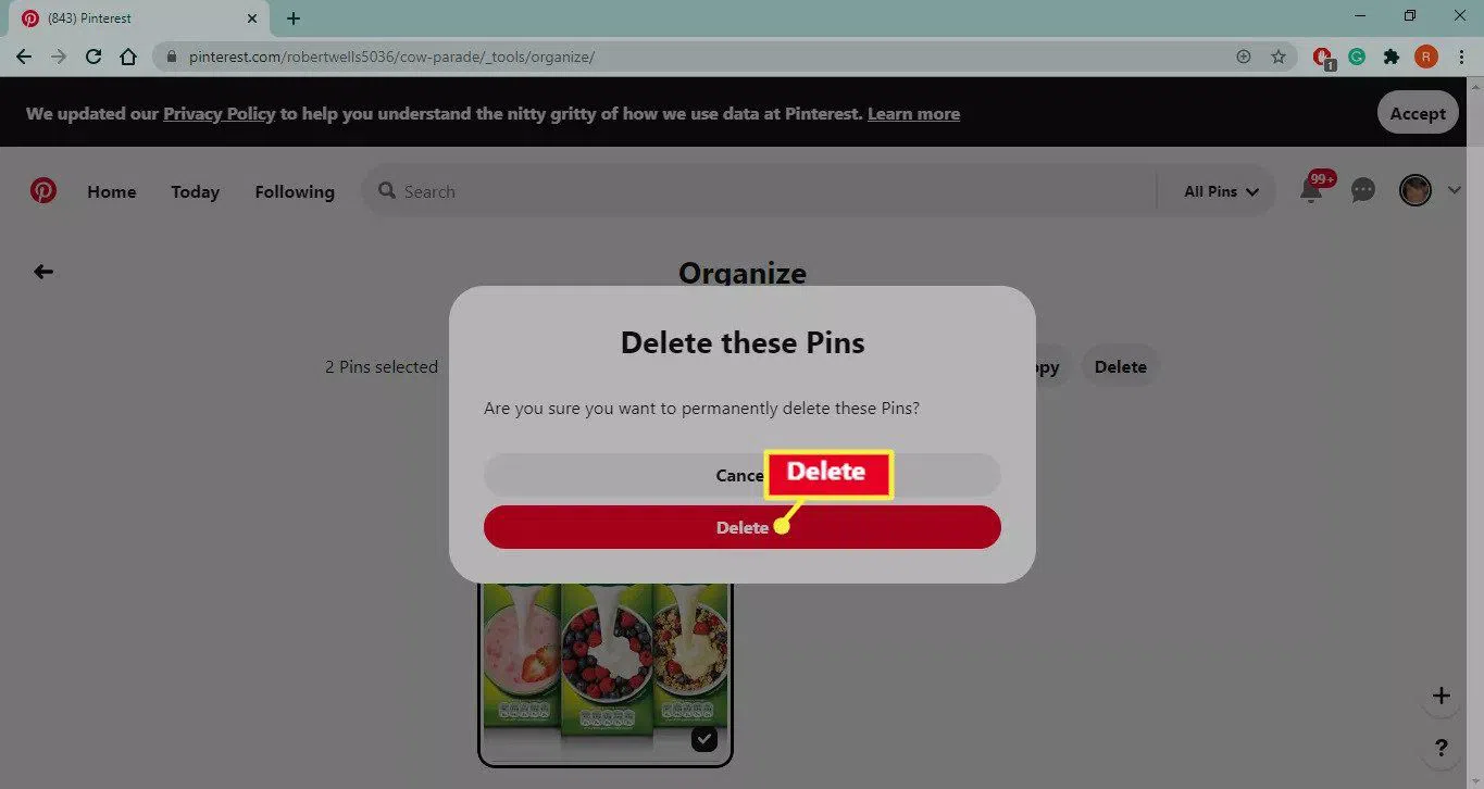 Как удалить сообщение в Pinterest?