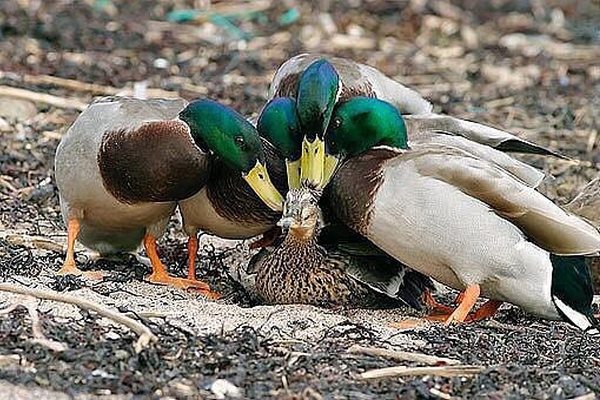 Если понаблюдать за утками, то можно увидеть, как одна утка проявляет насилие, сидя на другой. Иногда они могут топить друг друга. А зачастую самки лишаются перьев на затылке и глаза.