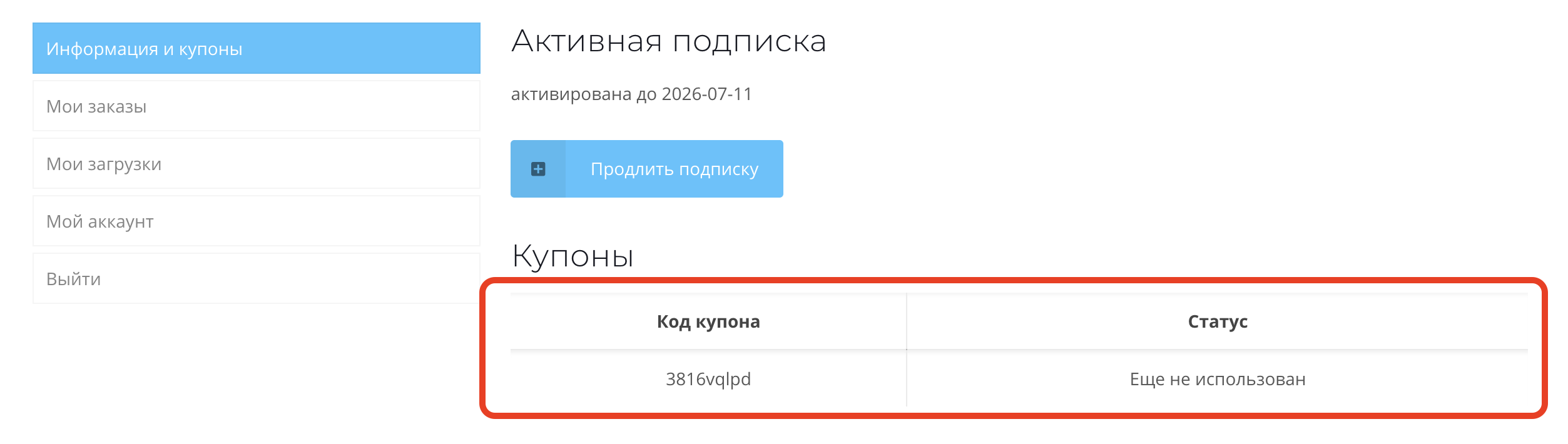 После этого в левом меню выберите пункт "Информация и купоны" и на открывшейся странице будут показаны все доступные промокоды (купоны).
