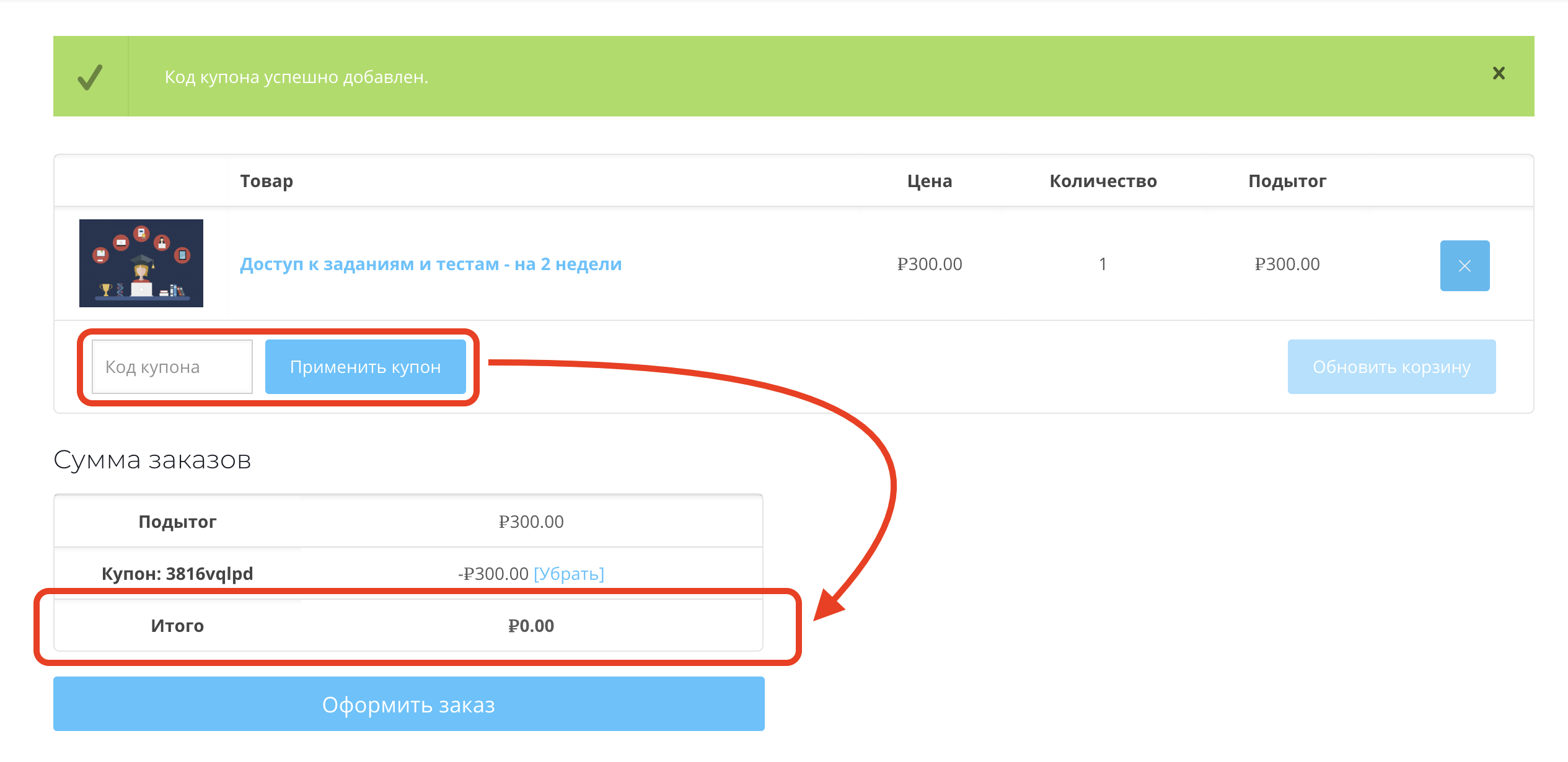 Введите номер вашего промокода и нажмите кнопку "Применить купон". После этого итоговая стоимость заказа станет равной нулю.