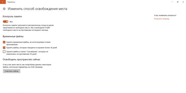 После этого Windowsначнёт с определённой периодичностью удалять все ненужные временные файлы, содержимое корзины и старьё из папки «Загрузки». Нажмите «Изменить способ освобождения места», и сможете сделать так, чтобы какие-то из этих категорий система не трогала.