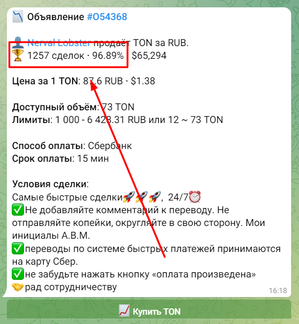 Перед подтверждением сделки обратите внимание на репутацию продавца и количество сделок. Будьте внимательны. После того как все проверили, нажимаем кнопку "Купить TON".