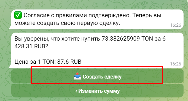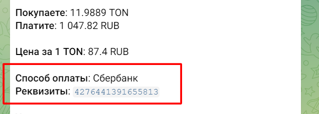 После создания сделки Вам нужно отправить сумму на указанные реквизиты продавца за валюту в которой Вы покупаете TON.