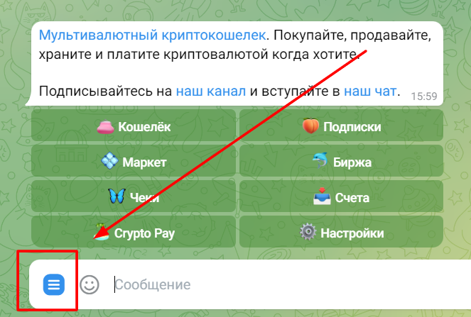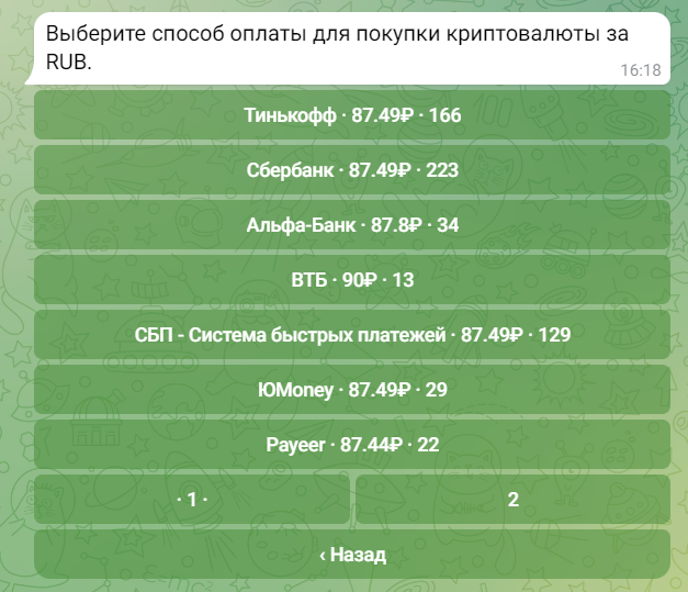Перейдите в бота и выбери в меню: /market Buy and Sell Crypto