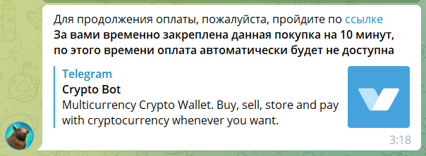 3️⃣ Перейдя по ссылки вы попадете в @CryptoBot, где будет сформирован счет на оплату участка. Осталось только оплатить. Ссылка будет доступна в течении 10 минут.