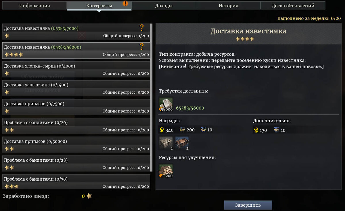 Найти доступные контакты можно открыв карту клавишей [M]: нажмите на любой город, выберите обзор, вкладку Контракты. Чтобы выполнить контракт, достаточно подойти к городу с требуемыми ресурсами/трофеями, нажать на город, выбрать «Информация», выбрать контракт и нажать кнопку Завершить. Выполняя хотя бы двухзвёздочные контракты, вы можете набрать 1600 очков отваги для открытия новых отрядов, а также снаряжение для новых отрядов, которое можно использовать или продать на аукционе. С помощью пятизвёздочных контрактов можно набрать 8000 очков, но такие контракты гораздо сложнее выполнить, так как для них часто требуется уникальное оружие бандитов, которое не просто добыть. Кроме того, таких контрактов всего по 2 на каждый регион. Вы конечно можете сходить в другой регион и повыполнять контракты там, но оцените затраченное время. Возможно, проще посидеть в осадах.