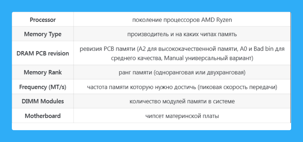 Калькулятор DRAM для Ryzen — это помощник в разгоне оперативной памяти на AMD Ryzen. Предлагает стабильные наборы таймингов памяти, оптимизированные для Вашего набора памяти. С ним Вы можете добиться качественного разгона памяти с большей стабильностью.