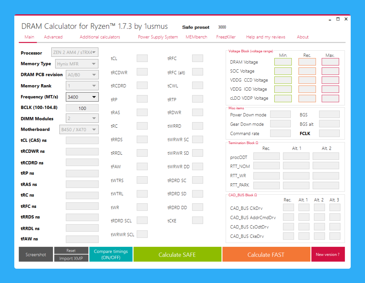 Сравнивая с предыдущей версии в DRAM Calculator for Ryzen 1.7.3 убрали кнопку R-XMP и Calculate EXTREME. Вместо них, добавили кнопки Calculate FAST для оптимизированных, стабильных настроек и Calculate SAFE для быстрых, но одновременно безопасных настроек.