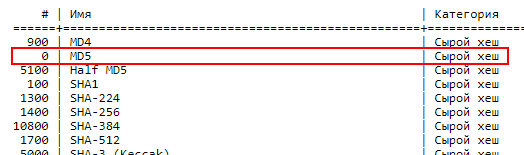 Для того, чтобы правильно запустить атаку в Hashcat, необходимо указать тип атакуемого хеша. Для этого используется опция -m, после которой необходимо указать число, соответствующее выбранному типу хеша.