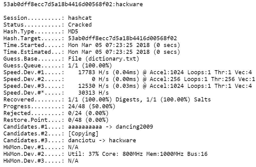 hashcat.exe -m 0 -a 0 53ab0dff8ecc7d5a18b4416d00568f02 dict.txt