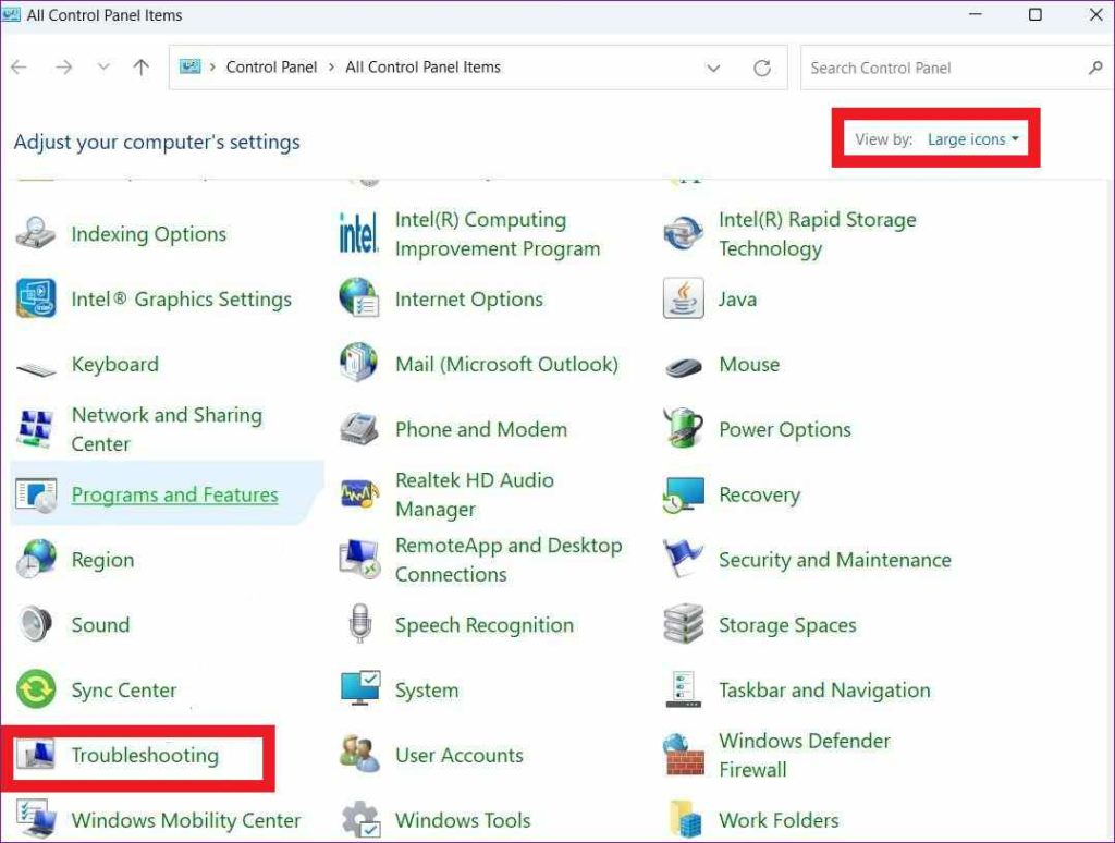 Запустите приложение "Панель управления" на компьютере с Windows 11. Теперь нажмите на Вид: Крупные значки.
