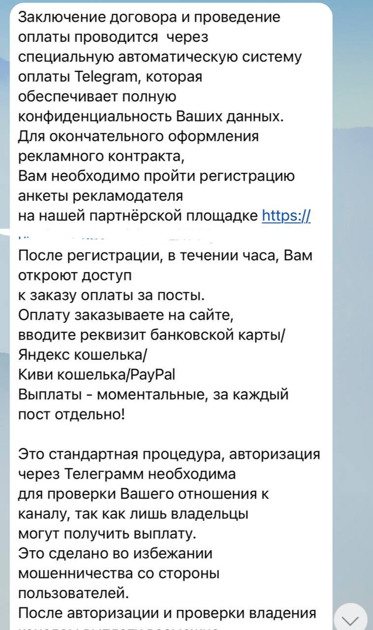 При поступлении рекламного предложения заказчик просит пройти проверку на их ресурсе, чтобы убедиться, что именно вы являетесь владельцем канала. Особенно весело читать, как они преподносят это условие: «Авторизация через Telegram необходима для проверки вашего отношения к каналу, так как лишь владельцы могут получать выплаты. Это сделано во избежание мошенничества со стороны пользователей». Думаем, что происходит дальше, вы уже догадались.