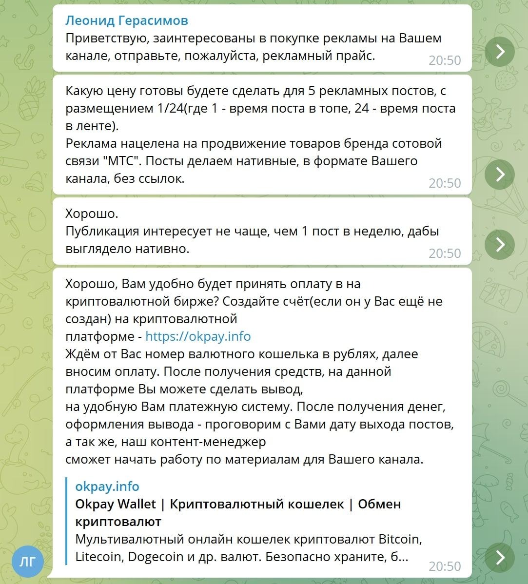 Начинается всё с того, что к владельцу канала обращается якобы потенциальный заказчик, представляясь менеджером известного бренда. Чаще всего мошенники представляются менеджерами известных компаний, активно размещающих рекламу в Telegram-каналах. Более того, могут быть подобраны специализированные компании, которые соответствуют теме канала. Чтобы заинтересовать и усыпить бдительность, они заявляют о своём желании приобрести сразу серию размещений (от 5 и больше), при этом совсем не ищут выгодных предложений, а сразу же соглашаются на большую сумму, без просьбы о скидке.