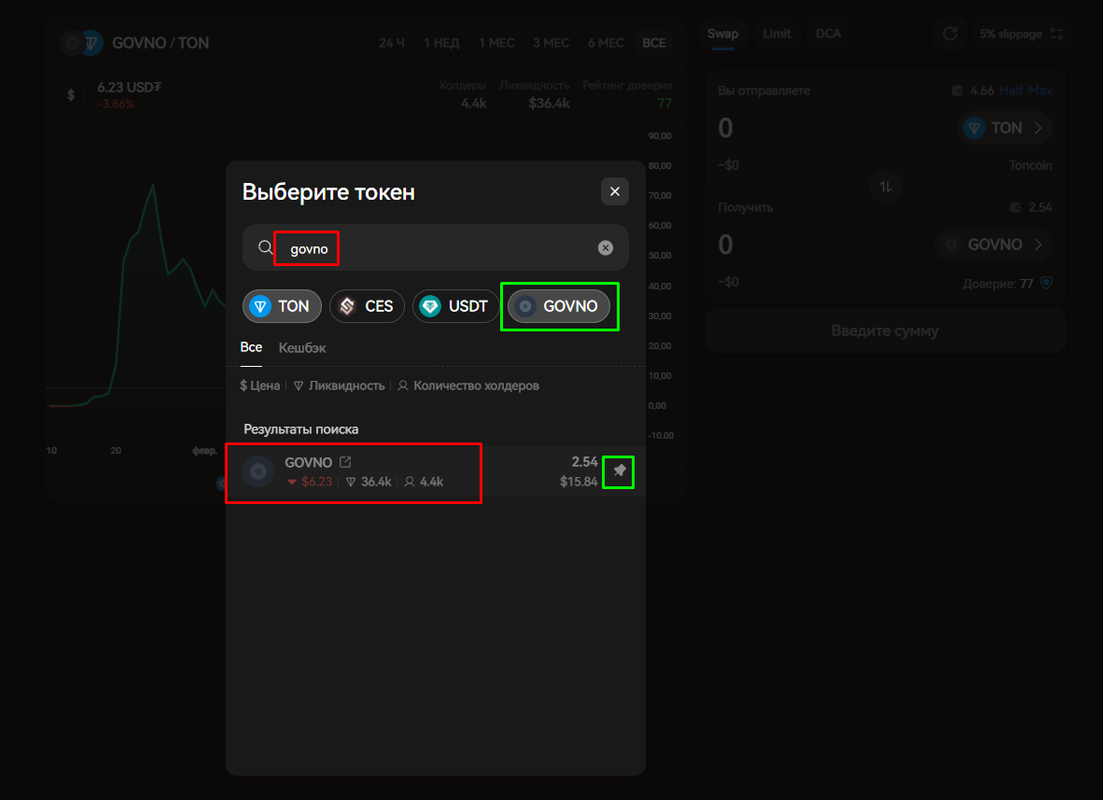 - При желании можете нажать на ПИН (на скриншоте выделен зеленным), так вы закрепите токен GOVNO в быстрый набор (кнопки сразу под поиском) на своем аккаунте.