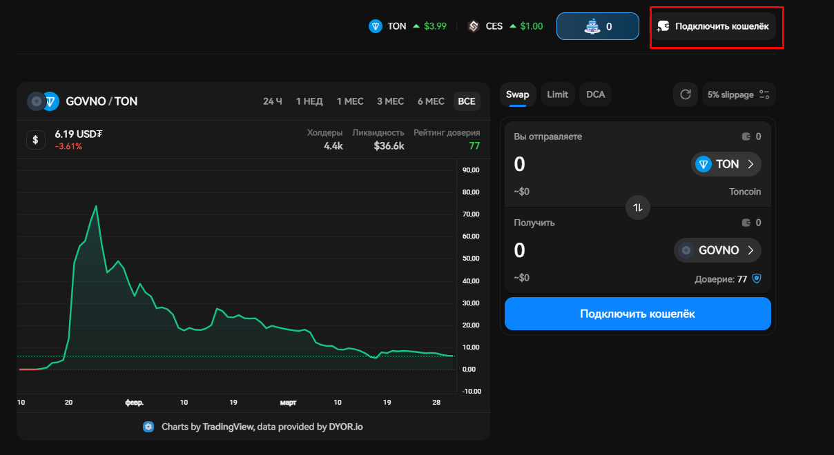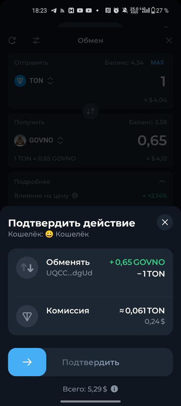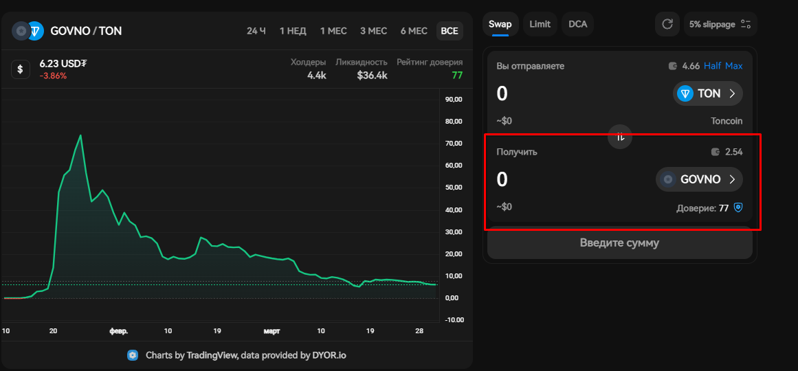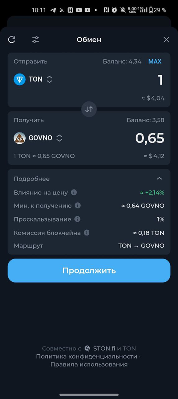 В TonKeeper обмен происходит фиксировано через Ston.Fi и только с помощью доступных валютных пар с $GOVNO на этом DEX (на момент написания это TON и USDT) - что не гарантирует лучший курс обмена.