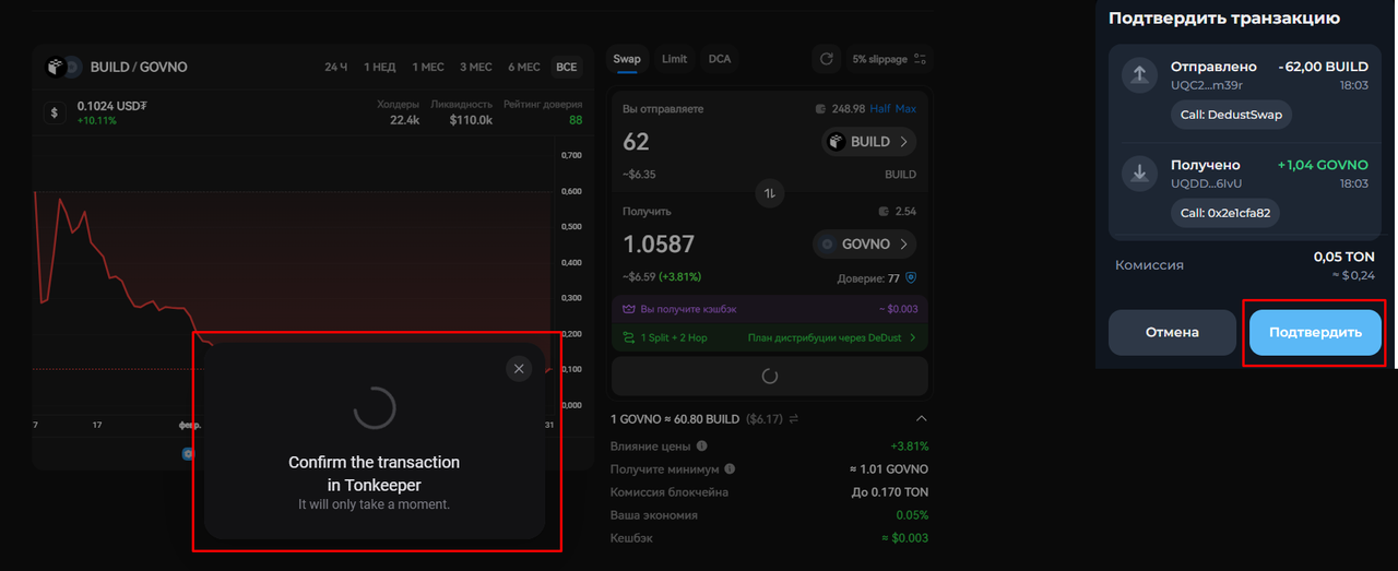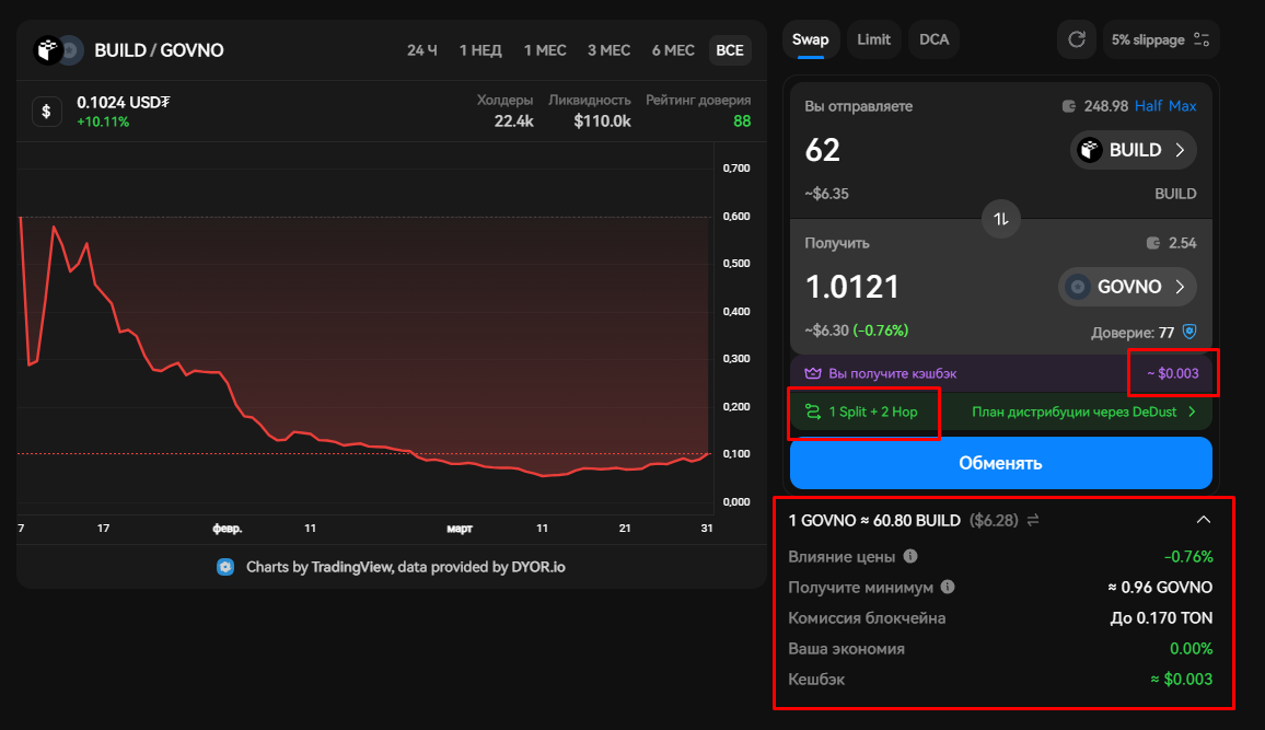 - После того как выбрали пару, вводим в разделе "Вы отправляете" количество монет какое хотим обменять и получаем следующую информацию: кэшбэк (если есть); путь обмена (для примера выбран токен Build у которого нет пары с GOVNO, поэтому сначала его конвертируют в TON в текущем примере); общую информацию (влияние цены, комиссия и т.д.)