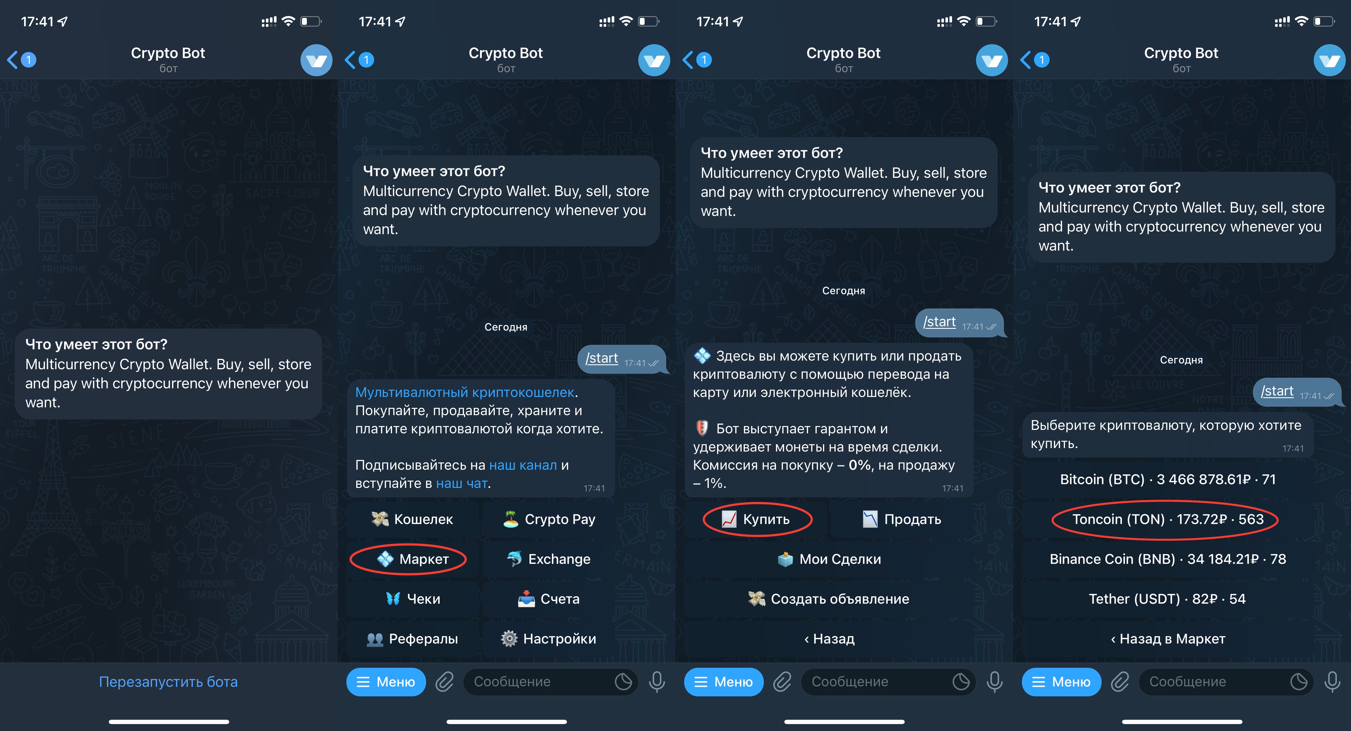 • После подтверждения сделки криптовалюта начисляется на ваш кошелёк бота.