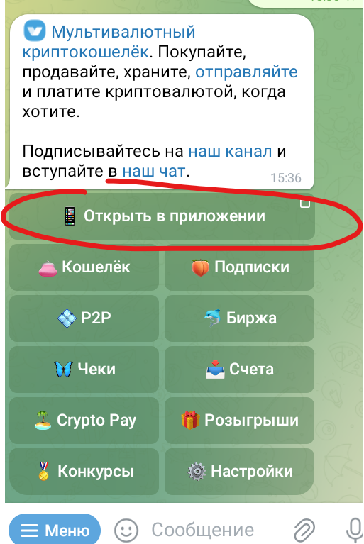 2. Перед нами предстают возможности этого бота, мы нажмем кнопку "📱Открыть приложение"