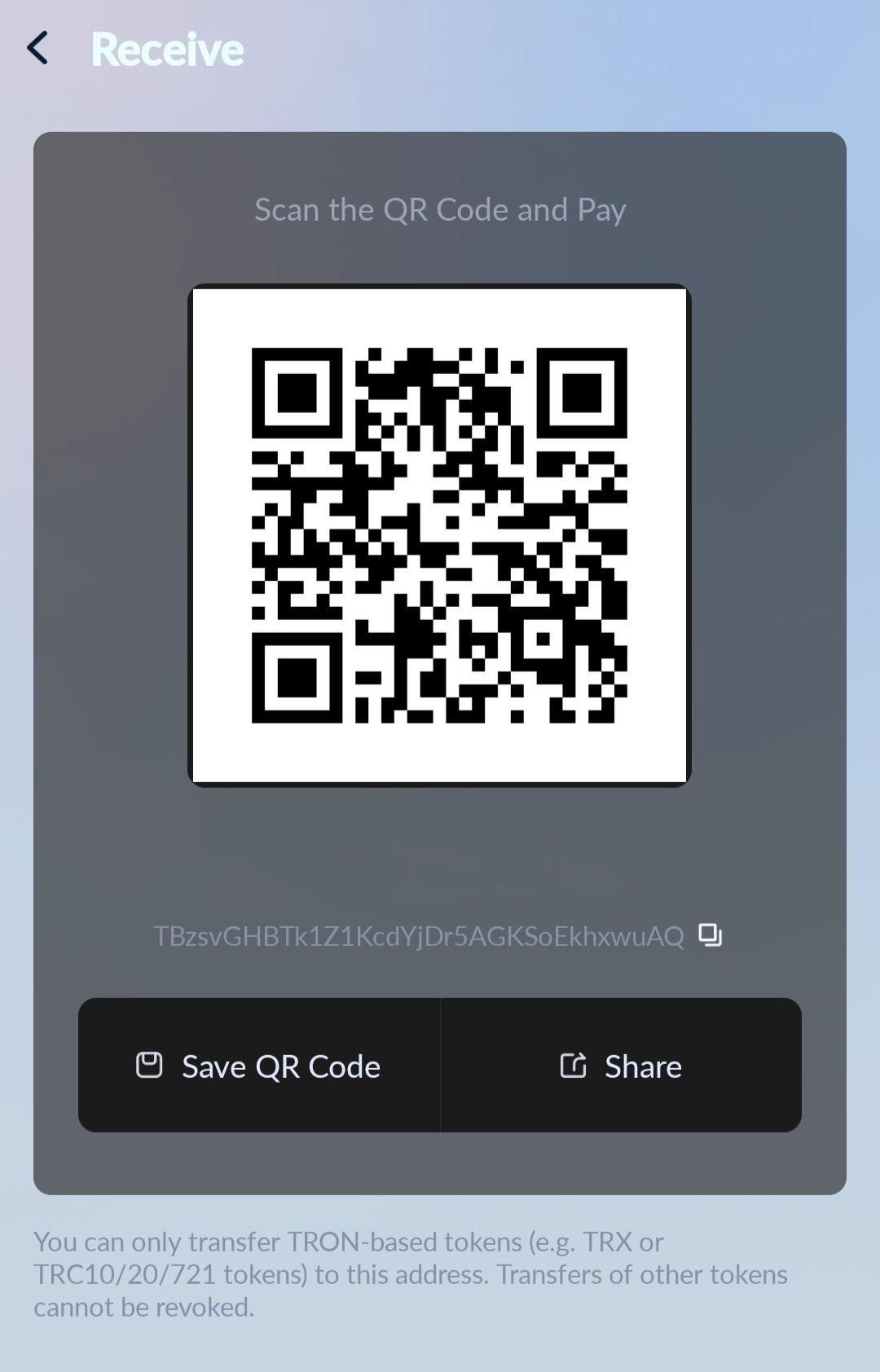 После, чтобы получить ваши trx, нажимаете на данную криптовалюту и выбираете кнопочку receive.